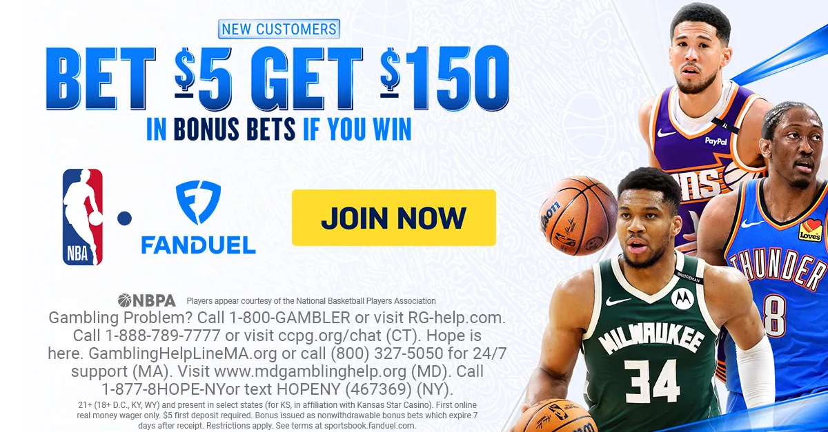 Must be present in select states (for KS, in affiliation with Kansas Star Casino). First online real money wager only. $5 first deposit required. Bonus issued as nonwithdrawable bonus bets which expire 7 days after receipt. Restrictions apply. See terms at sportsbook.fanduel.com.