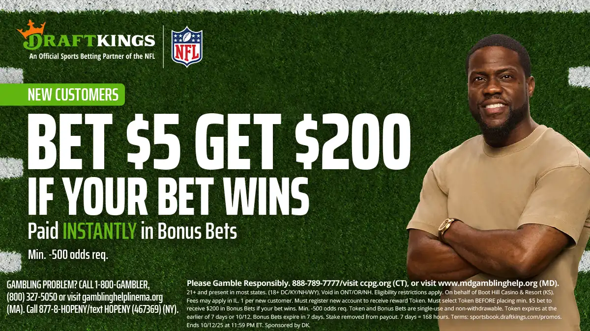 21+ and present in most states. (18+ DC/KY/NH/WY). Void in ONT/OR/NH. Eligibility restrictions apply. On behalf of Boot Hill Casino & Resort (KS). Fees may apply in IL. 1 per new customer. Must register new account to receive reward Token. Must select Token BEFORE placing min. $5 bet to receive $200 in Bonus Bets if your bet wins. Min. -500 odds req. Token and Bonus Bets are single-use and non-withdrawable. Token expires 10/19/25. Bonus Bets expire in 7 days (168 hours). Stake removed from payout. Terms: sportsbook.draftkings.com/promos. Ends 10/12/25 at 11:59 PM ET. Sponsored by DK.